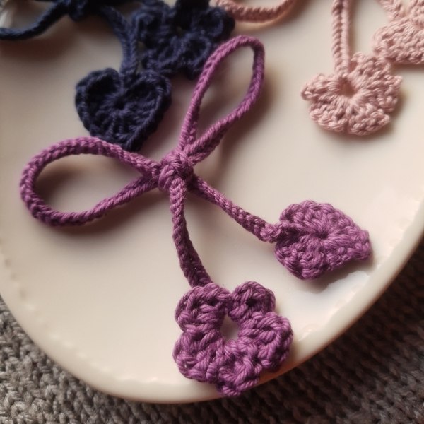 Sznureczki są stworzone na szydełku, z ozdobnymi zakończeniami. Tasiemka jest wykonana specjalnym splotem, gęstszym i mniej elastycznym niż klasyczny szydełkowy łańcuszek.