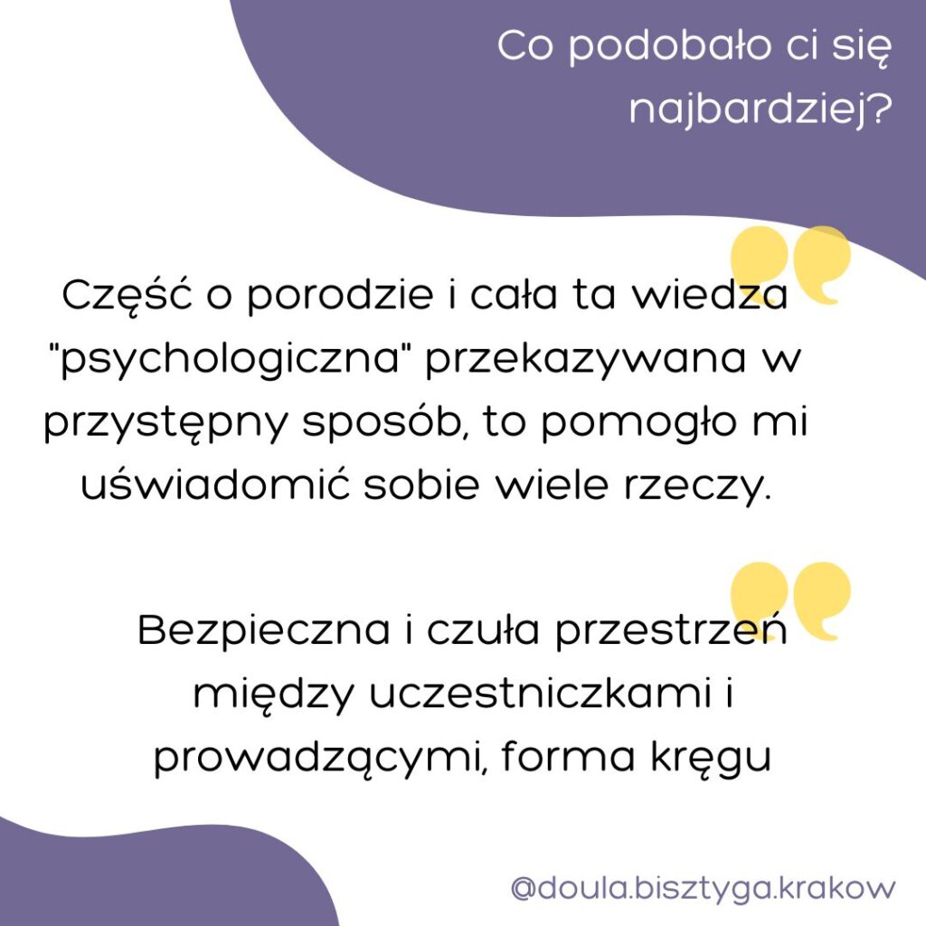 [Warsztaty dały mi] więcej świadomości w życiu mamy, dobre przeżycie i przygotowanie okołoporodowe. Dały mi konkretne skille które wykorzystywałam od razu w ciąży, porodzie i połogu.